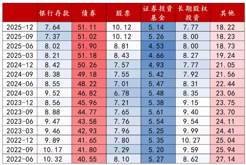 منذ عام 2022، أظهرت بيانات تخصيص الأصول لشركات التأمين على الحياة أن: