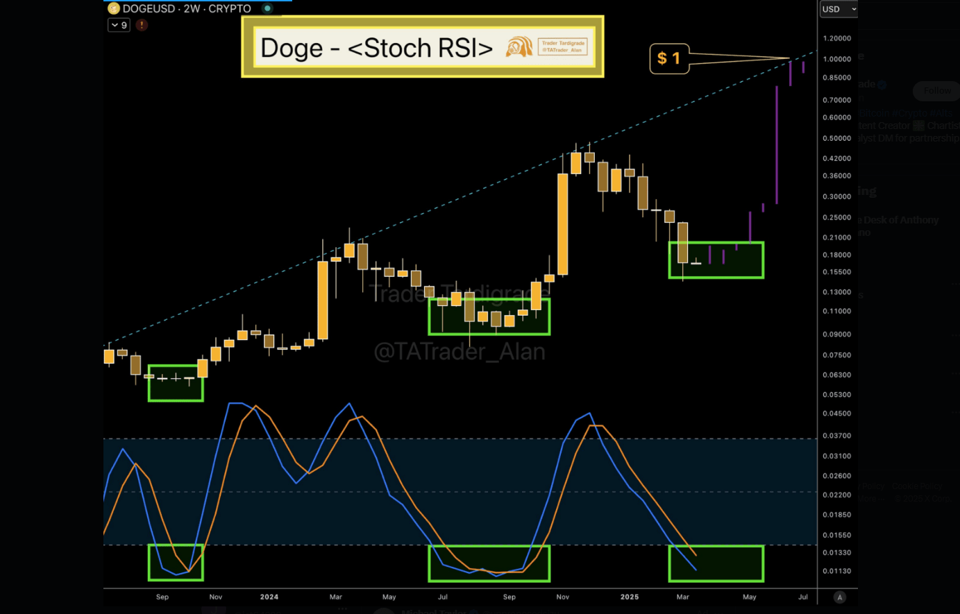قال المتداول تارديغريد في منشور إن التوقعات باستخدام مؤشر القوة النسبية العشوائي تشير إلى مستقبل مشرق للعملة المشفرة الميمية، مما يوحي بأنها يمكن أن تتعافى من الانخفاضات قصيرة الأجل مما يؤدي إلى ارتفاع الأسعار.