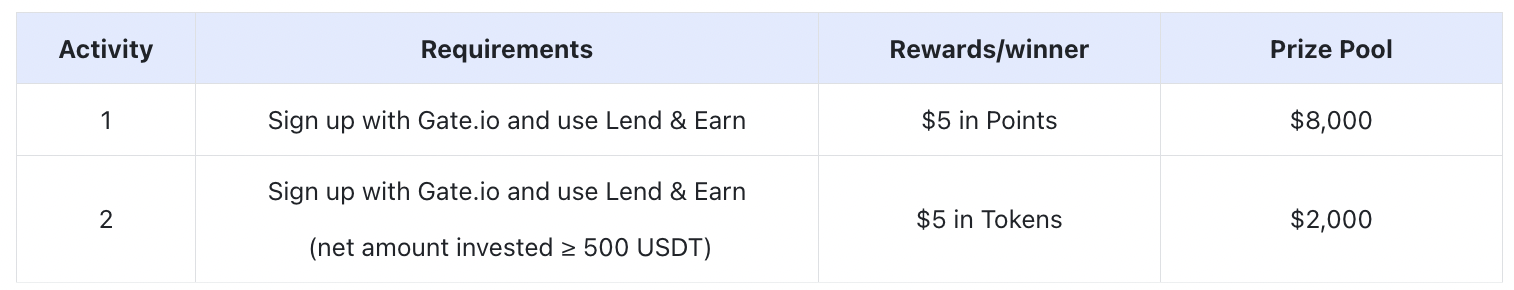 To join this activity and win rewards, you need to sign up with Gate and use Lend & Earn products. If you lend the amount as required, you'll have a chance to claim up to $5 in tokens. The total prize pool is $10,000. Come and join now!