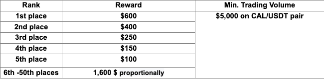 Top 50 users who reach the highest cumulative volume in CAL/USDT parity, will be rewarded according to the table below.