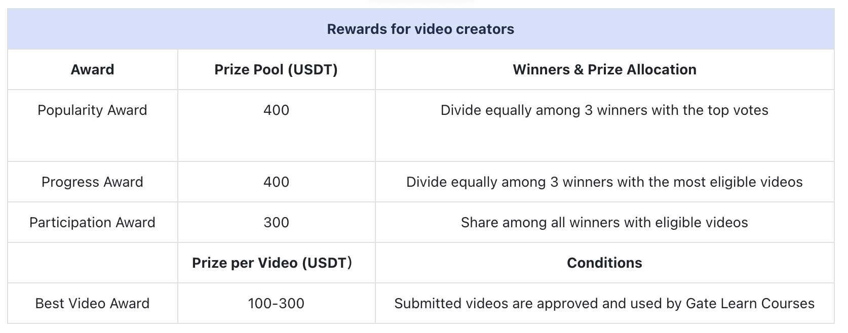 3.En este concurso, el premio al mejor vídeo se concederá a los vídeos que se utilicen en los cursos de Gate Learn. Si no hay ningún vídeo que gane este premio, no distribuiremos las recompensas.