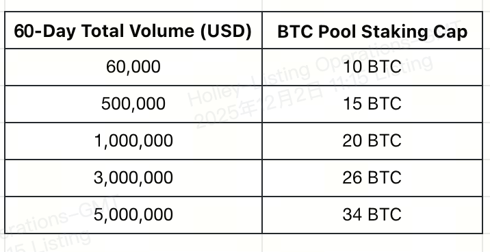 The system will distribute token rewards to users' spot accounts on an hourly basis, based on the proportion of assets they have staked. Users failing to achieve the minimum trading volume requirement of 60,000 USD within a 60-day period will be disqualified from participating in BTC staking and receiving hourly airdrop distributions. Please ensure you meet the minimum trading volume requirement in advance.