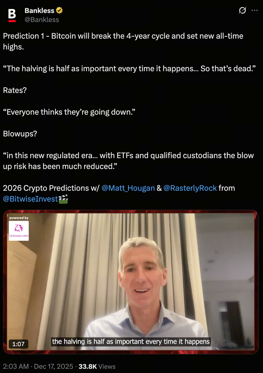 According to Bankless, the crypto market is gradually evolving from its early phase, previously dominated by retail sentiment and cyclical patterns, toward a more structured and institutionally-driven environment. By 2026, major digital assets such as Bitcoin may break away from the traditional four-year halving cycle, potentially reaching new all-time highs. Notably, Bitcoin’s volatility could even fall below that of leading tech stocks like Nvidia, signaling a maturing market.