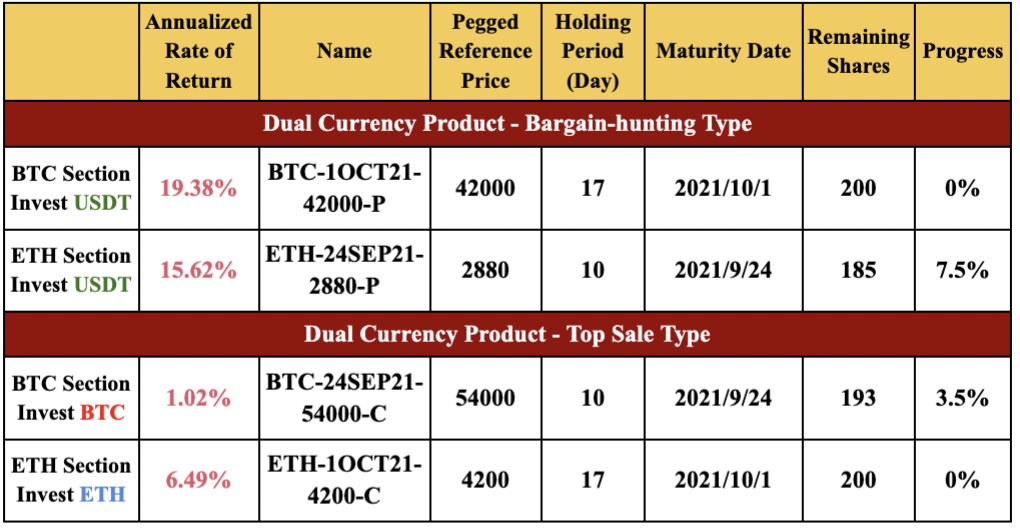 En la sección ETH, las fechas de vencimiento de los nuevos productos varían de 2 a 17 días con precios de referencia entre $3,000 y $4,000. El capital y ganancias se liquidarán por ETH o USDT.