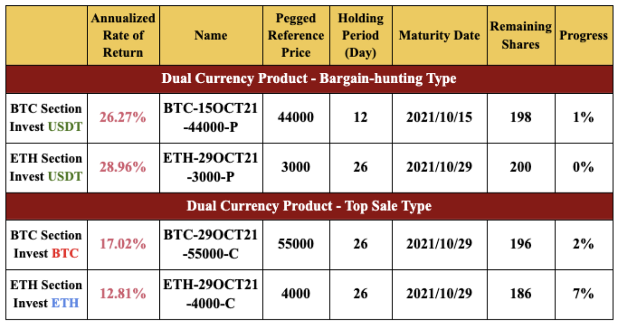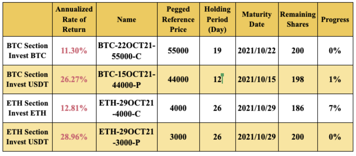 En la sección ETH, las fechas de vencimiento de los nuevos productos varían de 2 a 26 días con precios de referencia entre $3,000 y $4,000. El capital y ganancias se liquidarán por ETH o USDT.