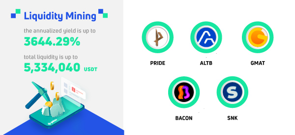 A total of 39 new versions of liquidity mining pools (Automated Market Maker AMM) were released on Gate, including TPRIDE, ALTB, GMAT, BACON, and SNK. As of April 15, 2022, their annualized yield is up to 3644.29%, and total liquidity tops at 5,334,040 USDT.