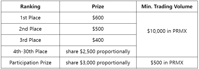 All qualified users based on trading volume can share $7,000 in PRMX.