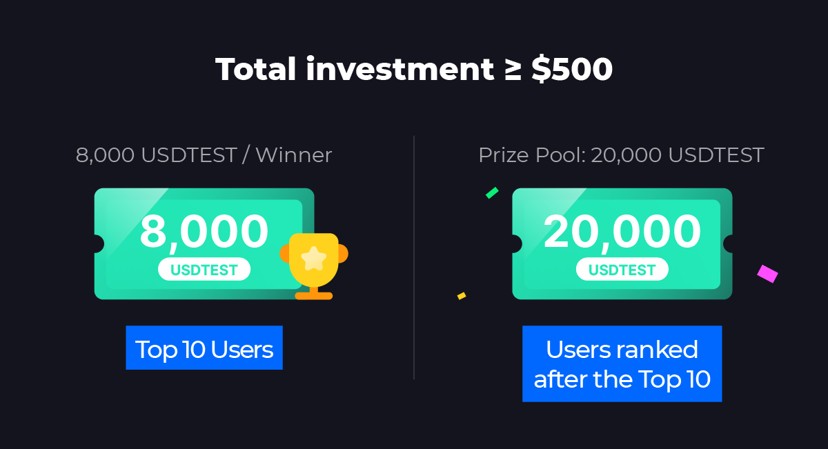 Durante el período del evento, los usuarios que inviertan en Dual-Investment, con un monto de suscripción total de ≥ $500, recibirán una recompensa garantizada del fondo de premios USDTEST de $100,000. Los 10 mejores usuarios en términos de monto de inversión durante el período del evento recibirán cada uno 8,000 USDTEST, mientras que los usuarios participantes restantes compartirán el premio restante de 20,000 USDTEST.