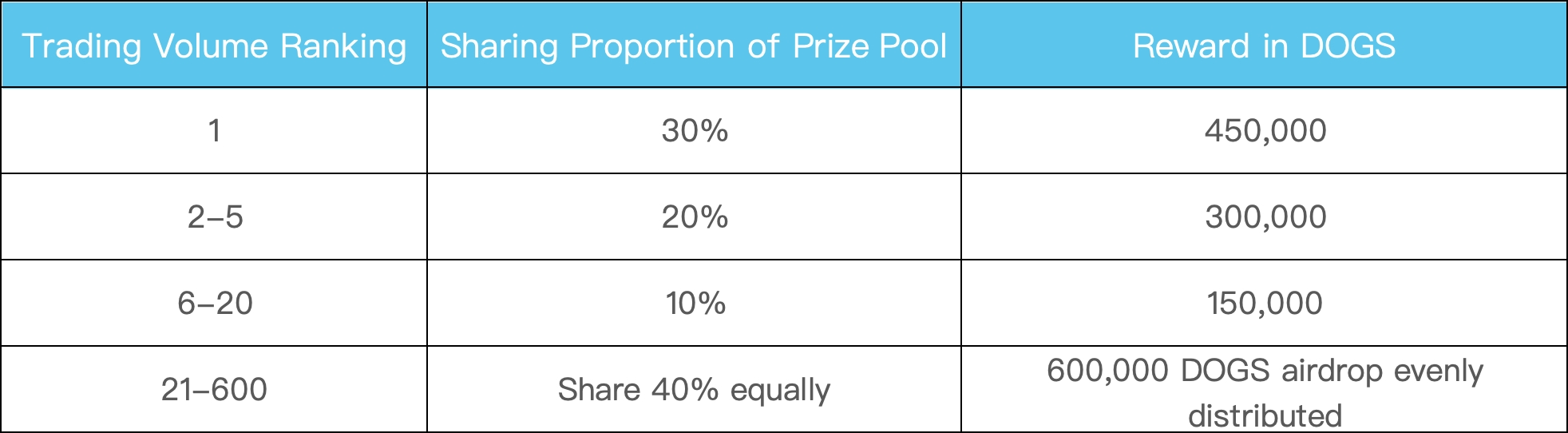 Durante el evento, los nuevos usuarios o aquellos que realicen su primera operación de futuros con un volumen de operaciones acumulado (Spot + Futuros) de ≥ 100 USDT compartirán un pozo de premios de 1.500.000 DOGS según su clasificación final en volumen de operaciones. ¡Cuanto mayor sea el volumen de operaciones, mayor será la recompensa! Los detalles son los siguientes: