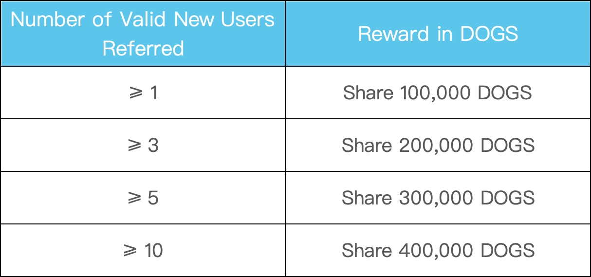 Durante el evento, tanto los usuarios nuevos como los existentes pueden recomendar a sus amigos que se registren y completen cualquier operación de futuros. Los recomendadores compartirán un pozo de premios de 1 000 000 DOGS según la cantidad de recomendados válidos. ¡Más recomendados significan más recompensas! Limitado hasta que se agote el pozo de premios. Los detalles son los siguientes: