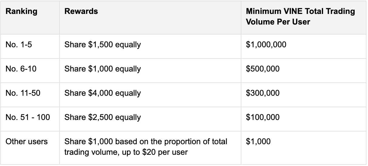 Durante el evento, los usuarios que acumulen un volumen total de comercio al contado y de futuros de al menos $1,000 en VINE compartirán un fondo de premios de $10,000 basado en su clasificación en el volumen total de comercio al contado y de futuros de VINE.