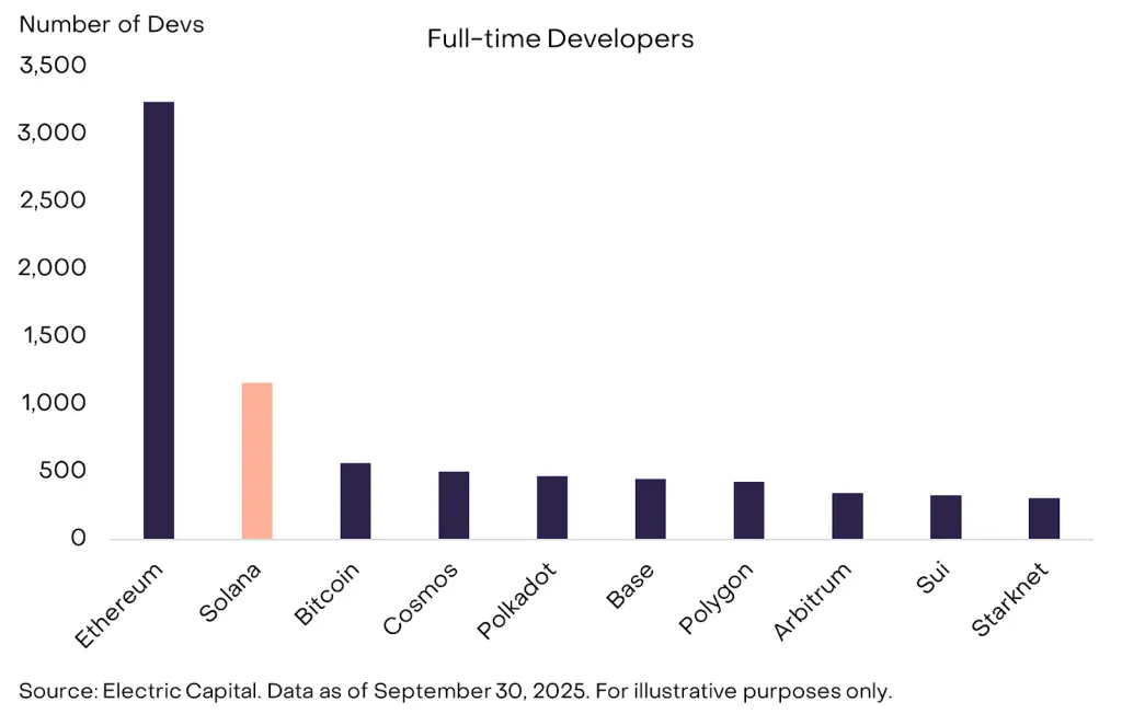 Más de 1,000 desarrolladores a tiempo completo están dedicados a Solana y a aplicaciones basadas en SVM. Según el informe de desarrolladores de blockchain de Electric Capital, el número de desarrolladores enfocados en Solana ha crecido más rápido que en cualquier otra plataforma de contratos inteligentes en los últimos dos años. Los desarrolladores son el activo central de cualquier ecosistema de blockchain, y su tasa de crecimiento a menudo precede al crecimiento de usuarios y al aumento de precios.