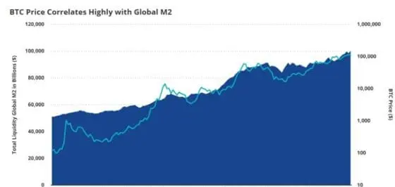 Durante el mismo período, la liquidez global de las 5 principales monedas casi se duplicó de aproximadamente $50 billones a $100 billones. Mientras tanto, el precio de Bitcoin se disparó alrededor de 700 veces durante este período.