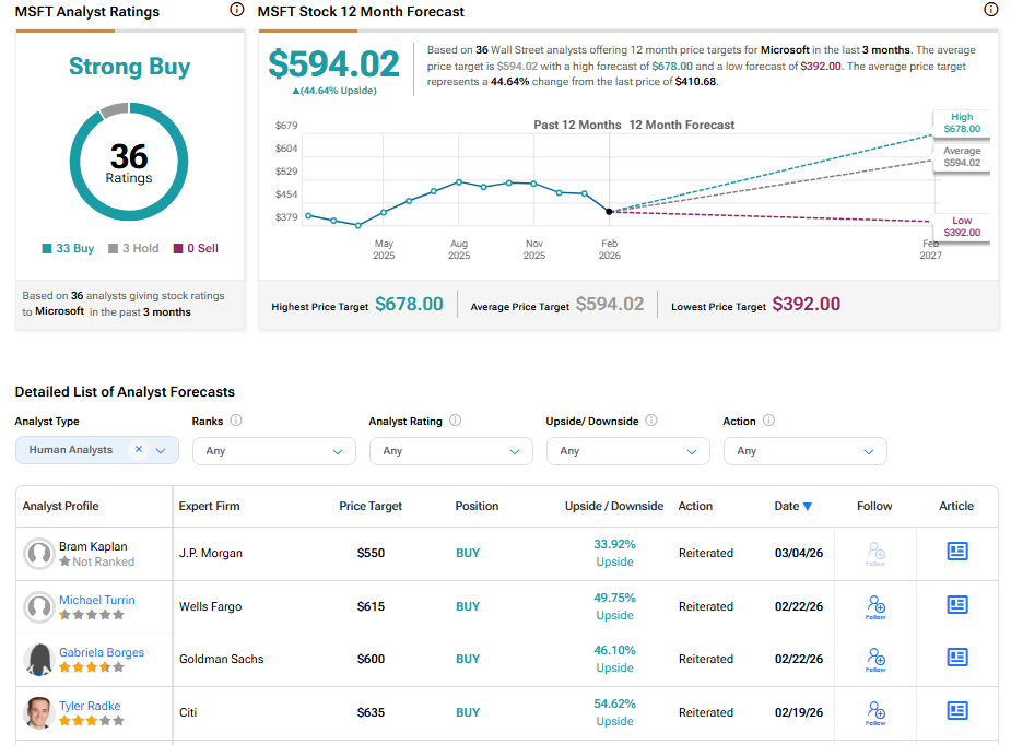 De acuerdo con Wall Street, los analistas tienen una calificación de Compra Fuerte en las acciones de MSFT, basada en 33 compras y tres mantenimientos en los últimos tres meses, según la gráfica a continuación. Después de una subida del 3.47% en su precio en el último año, el precio objetivo promedio de MSFT de $594.02 por acción implica un potencial de subida del 44.64%.