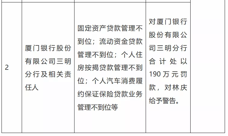 Por incumplimientos en la gestión de préstamos para activos fijos y otras conductas ilícitas, la sucursal de Xiamen Bank en Sanming fue multada con 1,9 millones de yuanes.
