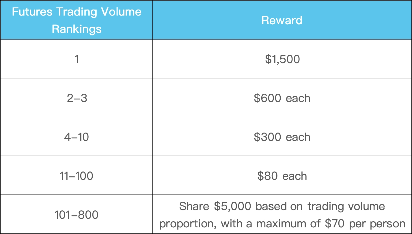 Tous les utilisateurs nouveaux et existants participant au trading de contrats à terme perpétuels sur marge USDT s'affronteront en fonction de leur classement en termes de volume de trading pour débloquer une cagnotte pouvant atteindre 20 000 $. Le meilleur trader peut gagner jusqu'à 1 500 $ !