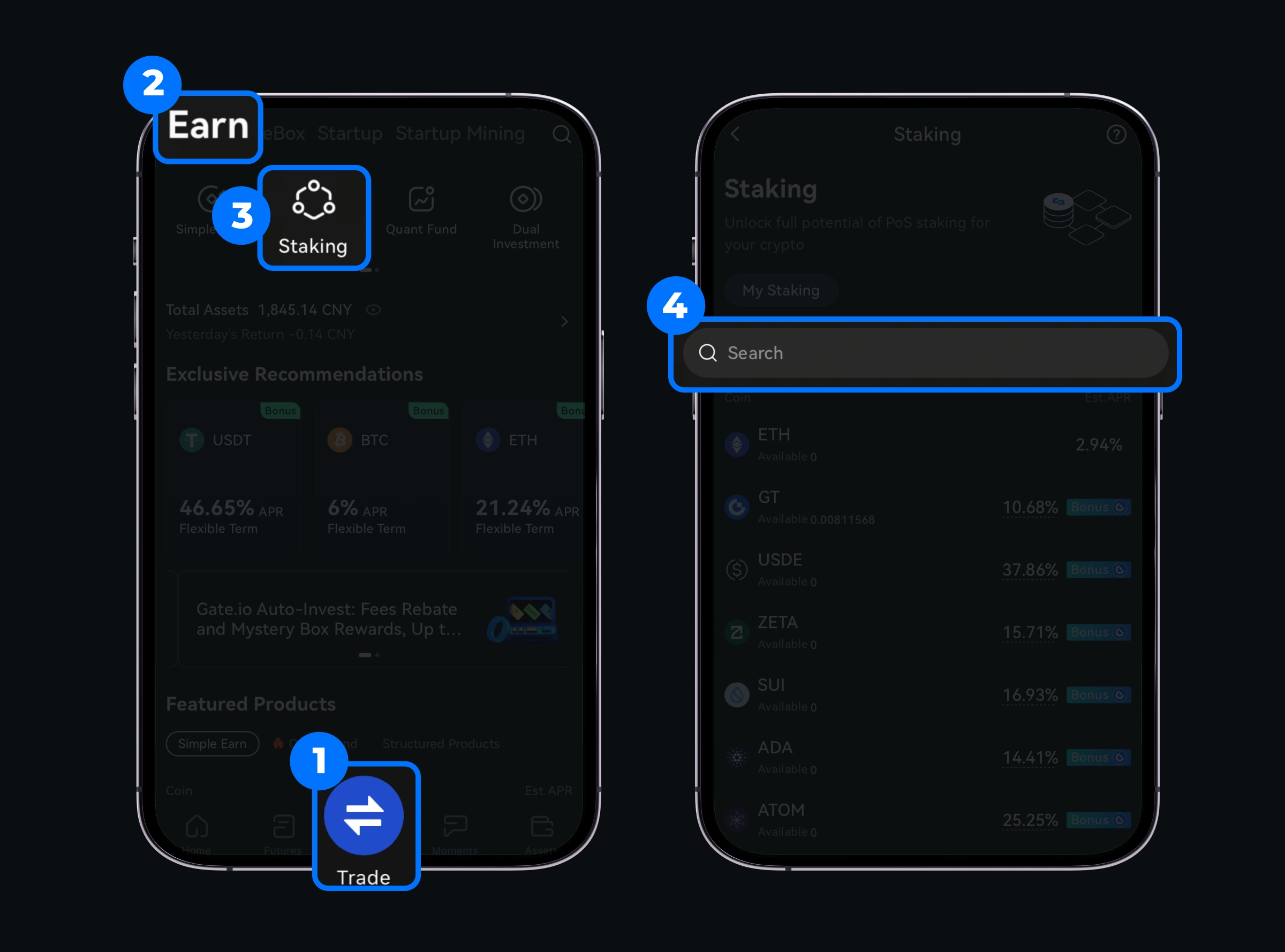 Web: Gagnez -> Staking et recherchez la cryptomonnaie correspondante à souscrire.
