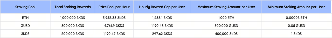 Gate Launchpool est prêt à lancer le projet #358 : 3KDS (3KDS). Les utilisateurs peuvent miser de l’ETH, du GUSD ou du 3KDS pour partager gratuitement 2 000 000 de jetons 3KDS. Les récompenses sont distribuées toutes les heures.