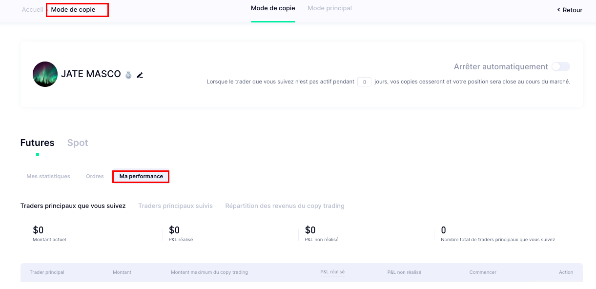 Les copieurs peuvent accéder à "Mon Copy Trading" - " Mode de Copie" et cliquer sur "Mes Performances" pour vérifier leurs transactions. Cliquez ensuite sur la page d'accueil du principal trader que vous suivez et cliquez sur "Ajuster le montant" pour transférer le montant de la restitution.