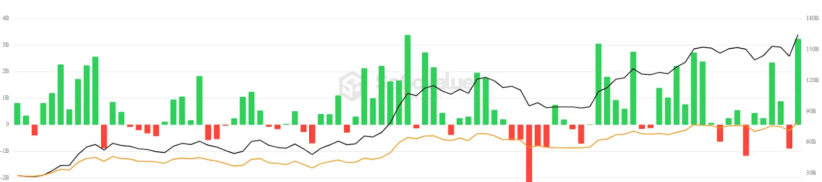 Les ETFs Bitcoin au comptant (BTC) ont enregistré des entrées nettes cumulées positives d'une valeur de 3,24 milliards de dollars au cours de la semaine dernière, presque en égalant leur record de 3,38 milliards de dollars pour la semaine se terminant le 22 novembre 2024, selon les données d'une plateforme.