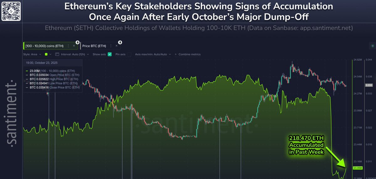 Entre le 5 et le 16 octobre, ces portefeuilles ont vendu environ 1,36 million d'ETH, mais ont depuis racheté près d'un sixième de ce total, équivalant à plus de 218 000 ETH en seulement une semaine. Le rebond a été décrit comme “un signe positif pour les principaux acteurs d'Ethereum” et un potentiel changement vers une confiance renouvelée parmi les grands détenteurs.
