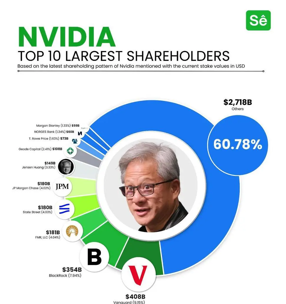 Le fondateur et PDG Jensen Huang reste l’un des plus grands actionnaires individuels de Nvidia, avec une participation estimée à $149 milliards, représentant un peu plus de 3,3 % de l’entreprise. Sa position le place aux côtés de grands noms institutionnels tels que Geode Capital, T. Rowe Price, Norges Bank et Morgan Stanley, combinant une forte alignement interne avec un soutien externe de poids.