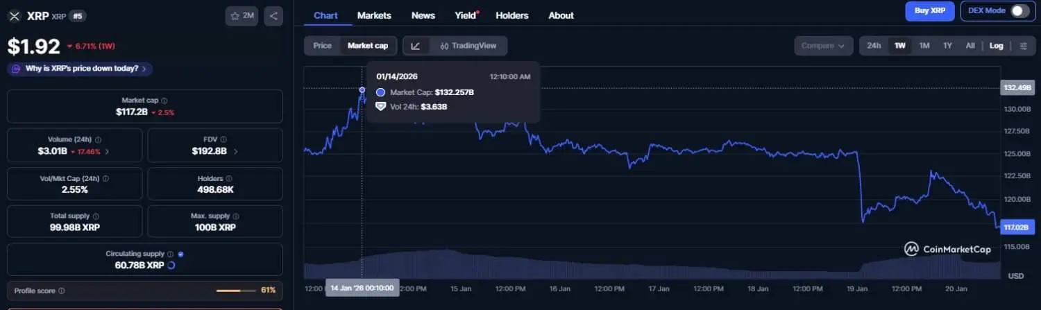 Source : CryptoNewsNet Titre original : XRP efface $15 milliards de sa capitalisation en une semaine Lien original : XRP a perdu environ $15 milliards de capitalisation boursière au cours des sept derniers jours, passant de $132 milliards le 13 janvier à $117 milliards au moment de la rédaction, le 20 janvier.