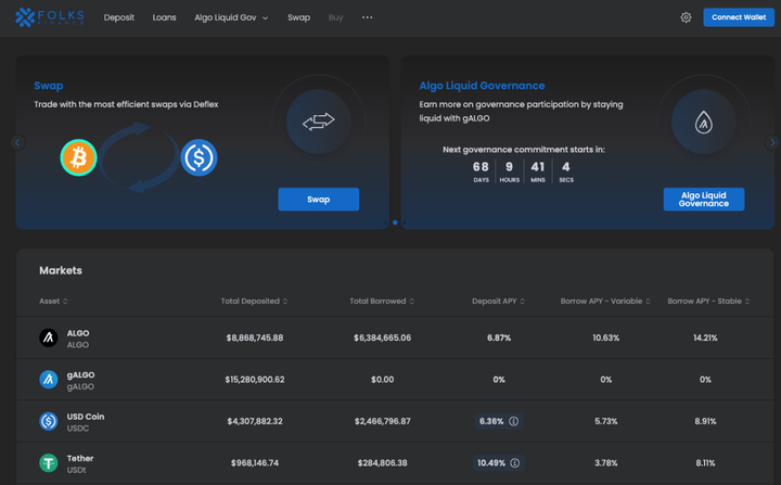 Folks Finance est le projet DeFi phare d’Algorand, en particulier après la fermeture d’AlgoFi. Folks Finance est à la fois un DEX et une plateforme de prêt. L’une des particularités de Folks Finance est l’utilisation des jetons gALGO et xALGO. gALGO représente la version sécurisée d’ALGO, les utilisateurs peuvent échanger ALGO contre gALGO, et gALGO peut être utilisé dans les applications DeFi, offrant la possibilité de gagner à la fois des promesses et des récompenses DeFi. Les récompenses de xALGO et gALGO sont obtenues de la même manière, mais elles sont converties en BRC-20 et peuvent être connectées à PancakeSwap sur Binance Chain.