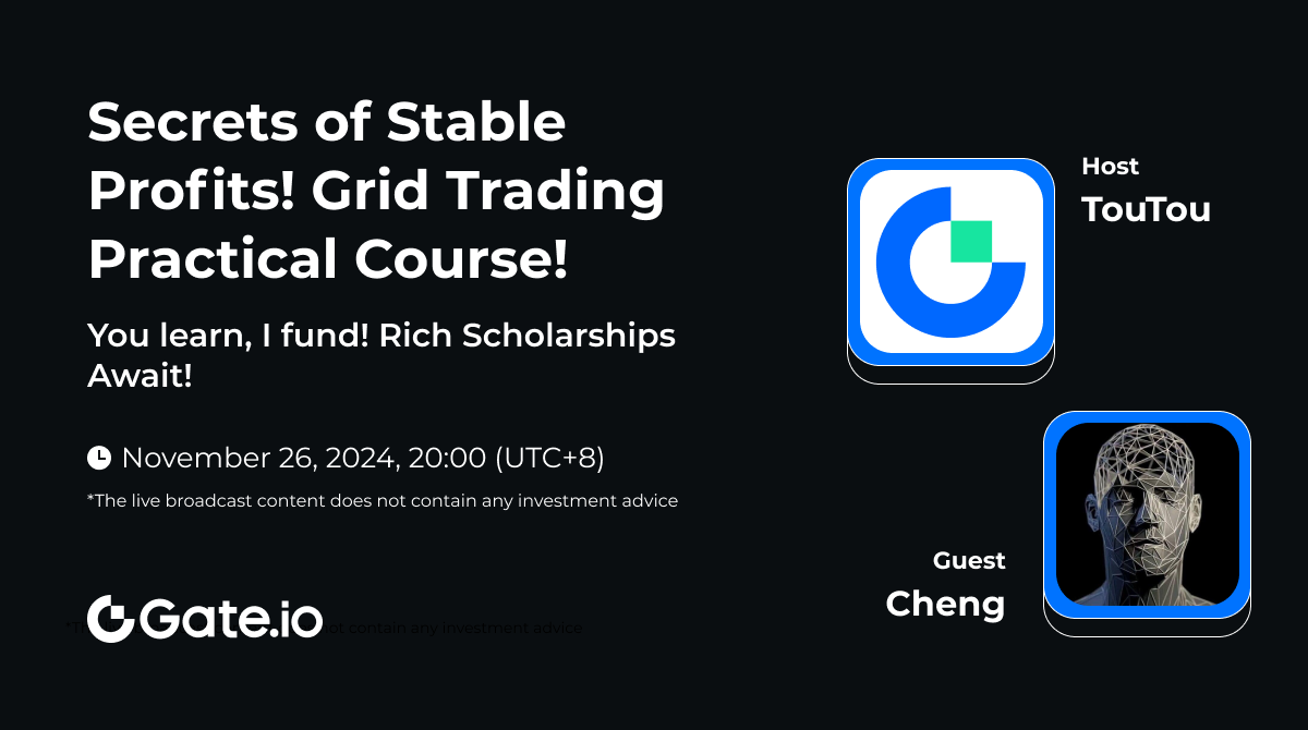 Gate will launch a live grid trading class on November 26 at 20:00 (UTC+8) for grid trading. This five-session hands-on course will guide you to experience the charm of stable profits without loss! Join the exclusive grid trading event in the livestream for lower thresholds and more benefits! Participate in interactive Q&A during the class, and you can randomly receive rewards such as Bots Trial Funds, VIP+1, Points, and more.