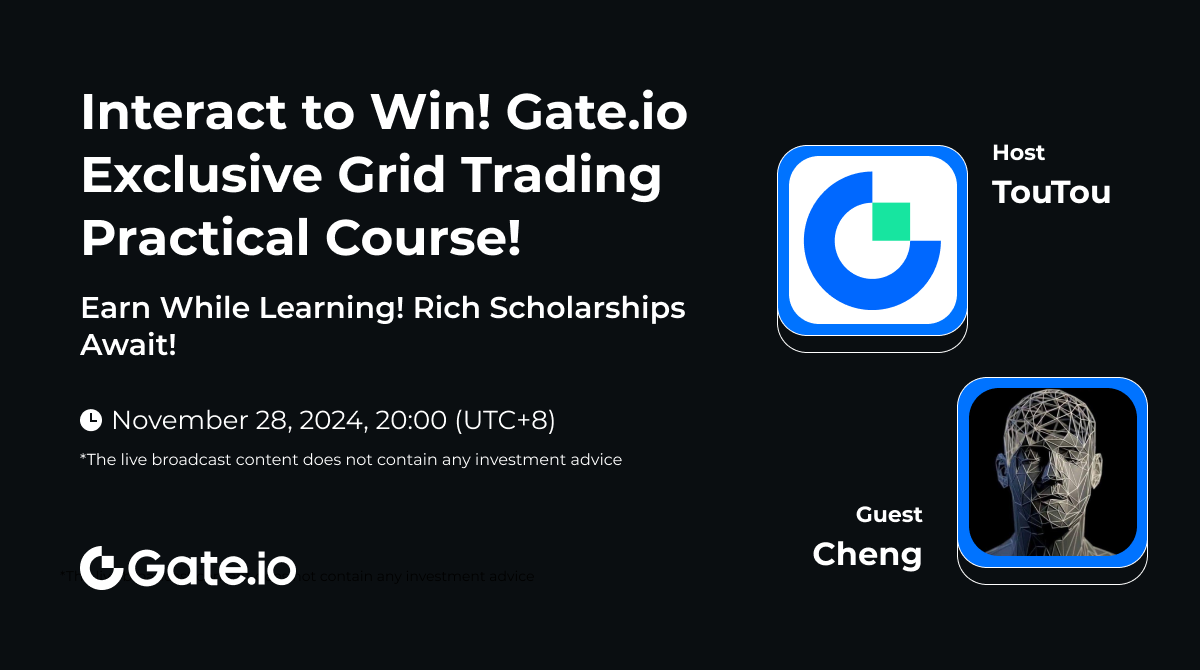 Gate will launch a live grid trading class on November 28 at 20:00 (UTC+8) for grid trading. As the bull market approaches, grid trading strategies can help you achieve steady profits amidst market fluctuations, ensuring worry-free earnings! Join the exclusive grid trading event in the livestream for lower thresholds and more benefits! Participate in interactive Q&A during the class, and you can randomly receive rewards such as Bots Trial Funds, VIP+1, Points, and more.