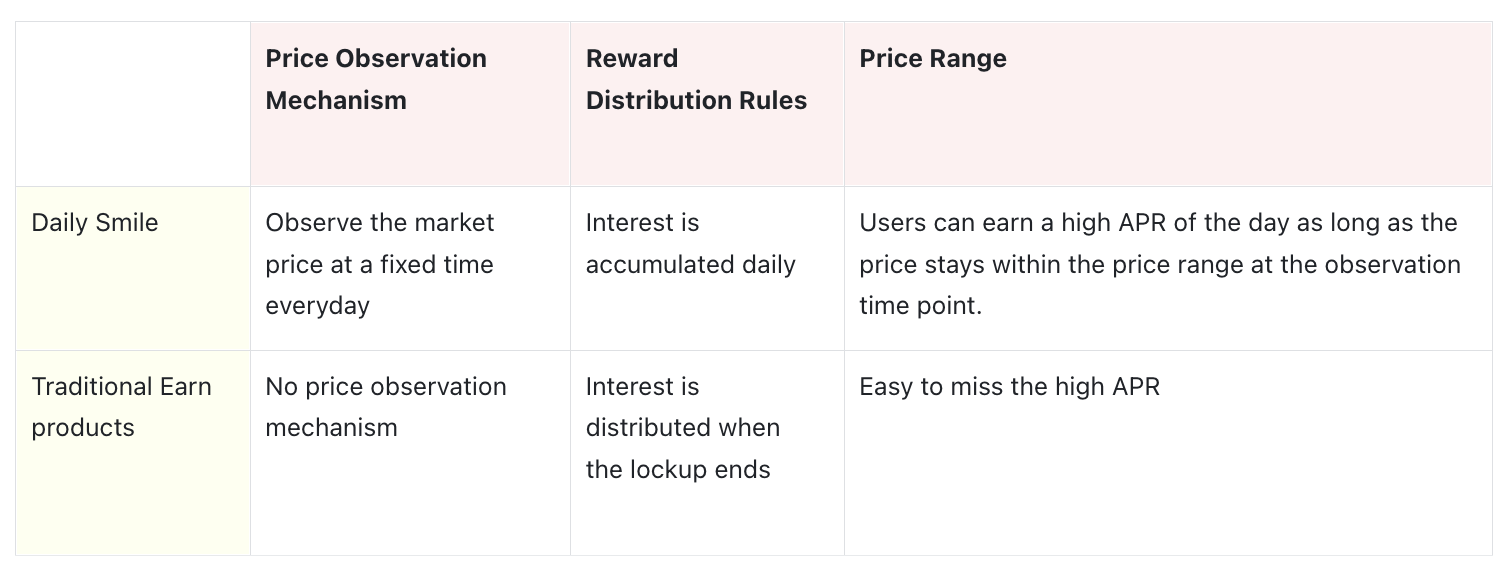 Users of Daily Smile can earn profits in two ways:1. During the observation period, if the price of the target asset stays within the price range (that is, hit the range), the user can obtain a high APR (Guaranteed APR < APR within the price range).