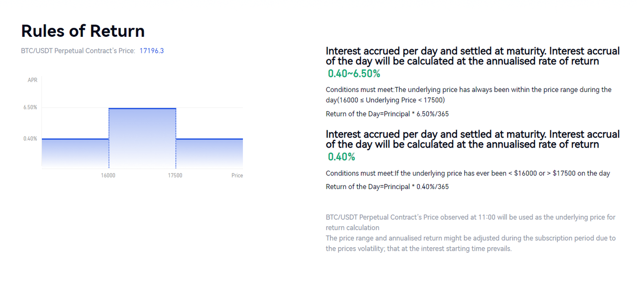 Day 1: If the reference settlement price of the day is $17,008 ($16,000 < $20,008 < $17,500), then the price hits the range. The APR will be 6.5%.