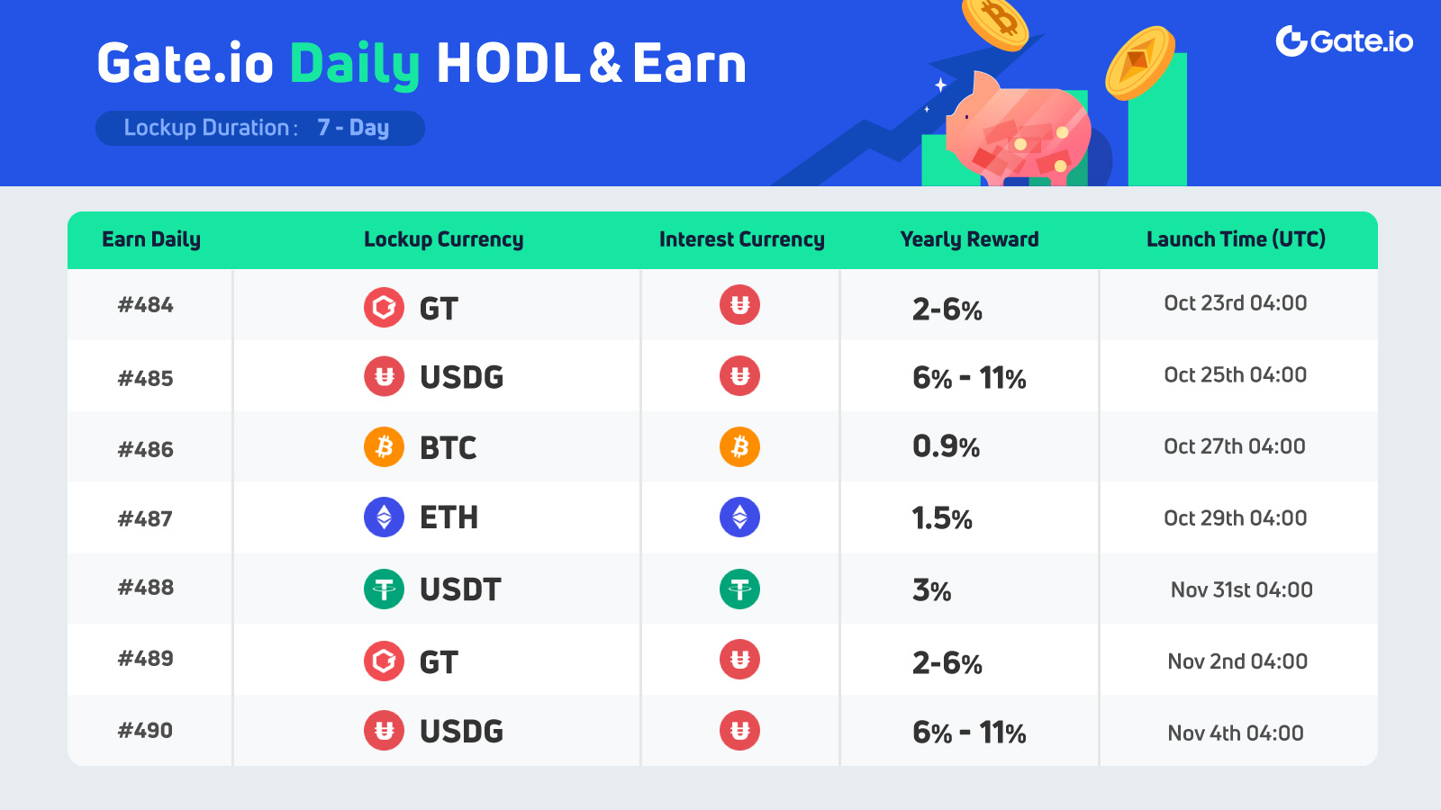 Gate Daily HODL & Earn USDG #485 will be launched at 4:00 UTC on October 25th at Gate's “HODL& Earn”. We are planning to lock 1,000,000 USDG in total for a period of 7 days, with an estimated reward of 6-11% P.A .