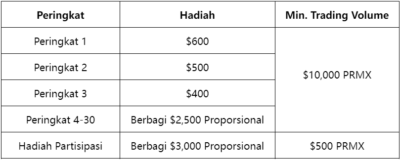 Semua pengguna yang memenuhi syarat berdasarkan volume perdagangan dapat berbagi $7,000 dalam bentuk PRMX.