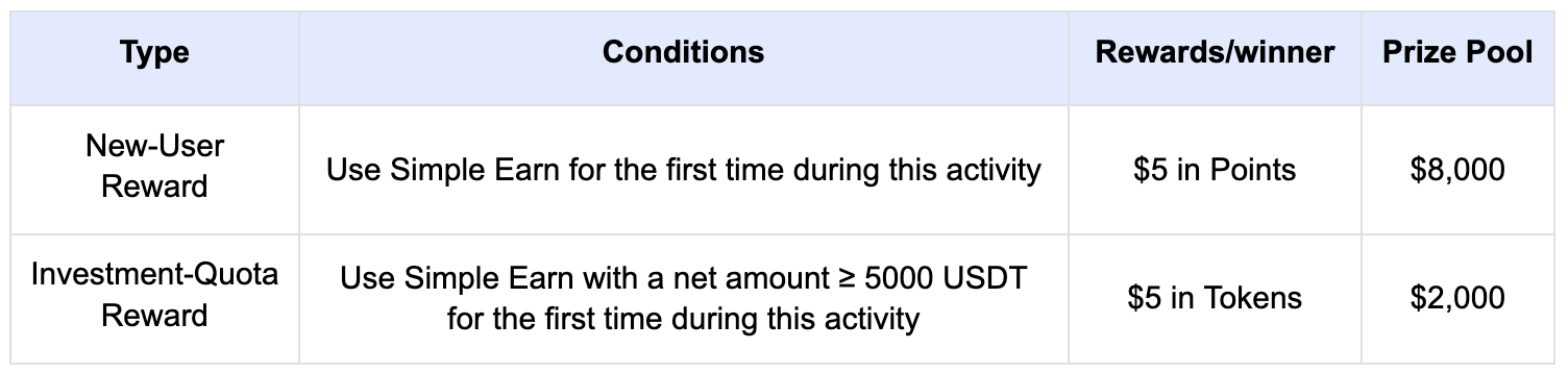 Selama aktivitas ini, pengguna yang menggunakan Simple Earn untuk pertama kalinya memiliki kesempatan untuk mengklaim Poin sebesar $5. Namun, jika jumlah investasi mereka mencapai 5000 USDT, mereka dapat mengklaim hadiah token sebesar $5. Total hadiahnya adalah $10.000. Datang dan bergabunglah sekarang!