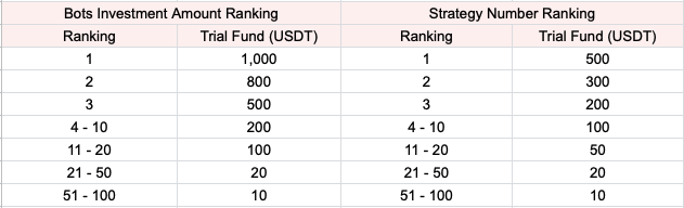 dan yang jumlah investasi dalam BOT**, hadiah Dana Uji coba adalah sebagai berikut: