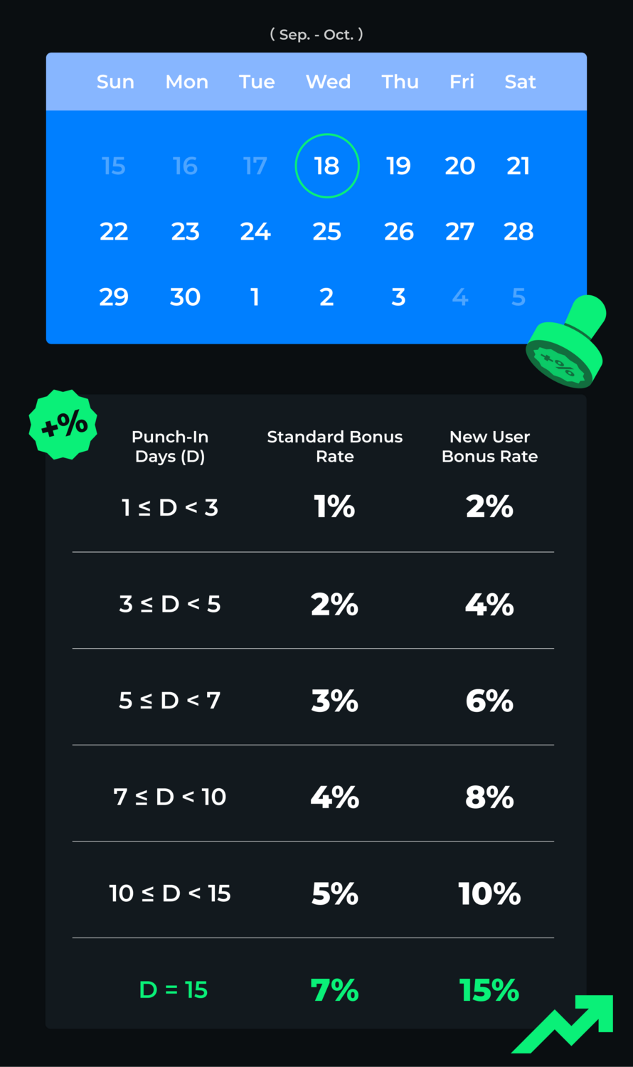 Registered users who maintain a daily net investment of ≥ $1,000 during the event will qualify for a successful punch-in. The bonus rate will be determined based on the total successful punch-in days, as outlined below: