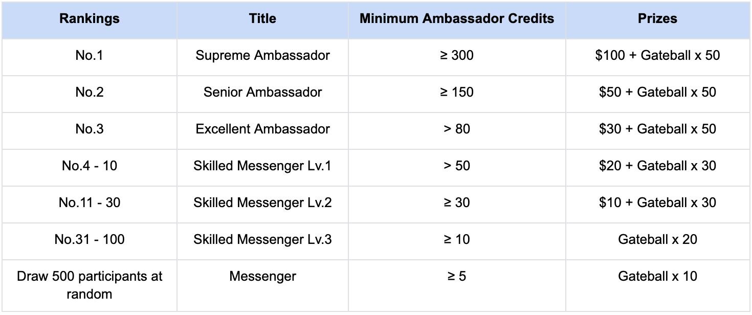 Participants will be ranked based on the amount of "Ambassador Credits" to get awarded the exclusive titles. Reaching the minimum Ambassador Credits, you will stand to win the fancy gifts.