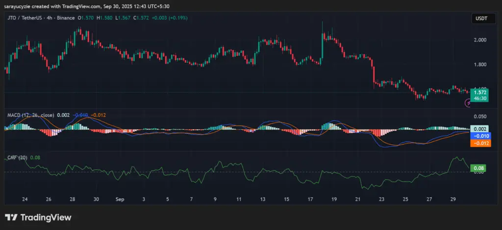 *JTO chart (Sumber: TradingView)*Selain itu, nilai indikator CMF sebesar 0,08 menunjukkan tekanan beli yang sedikit di pasar. Karena berada di atas 0, ada lebih banyak akumulasi daripada distribusi, tetapi momentum sedang, tidak terlalu kuat. Ini adalah sinyal bullish yang hati-hati, dan para trader mungkin menunggu konfirmasi yang lebih kuat.