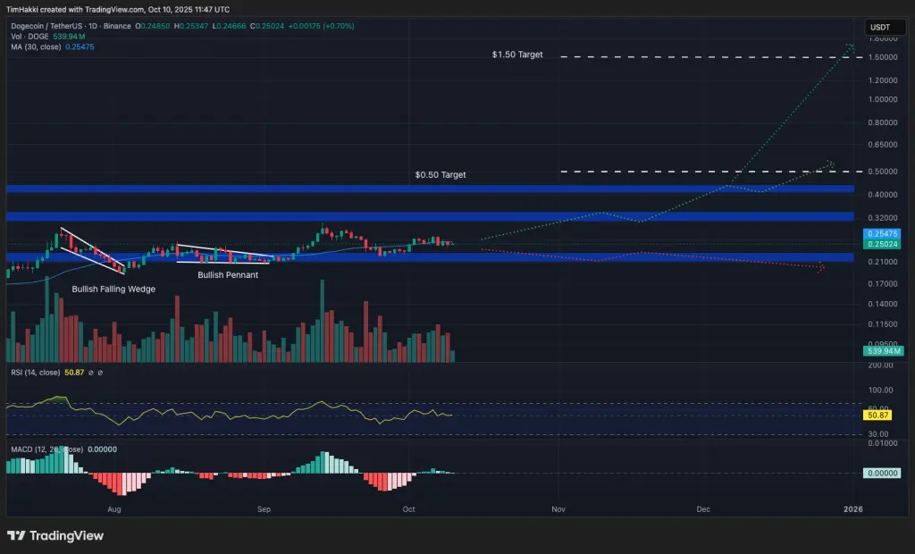 Indikator RSI Dogecoin berkisar sekitar 50 dan menunjukkan tren naik, data menunjukkan bahwa investor sedang mempercepat akumulasi. Pola grafik juga menyoroti beberapa bentuk bullish yang terbentuk pada tahun 2025, yang merupakan indikator potensi untuk terobosan besar ke atas.