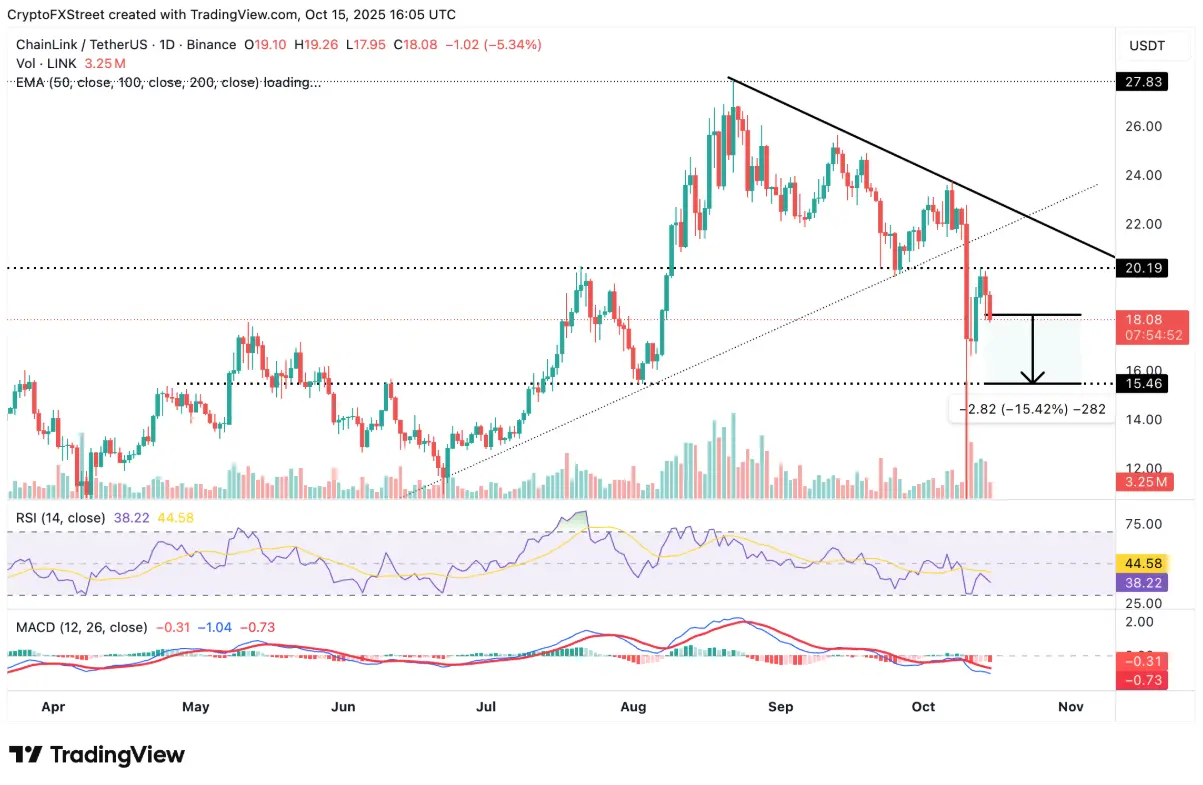 Pada saat penulisan artikel ini pada hari Rabu, Chainlink (LINK) diperdagangkan di level 18 USD, terpengaruh oleh gelombang penyesuaian yang meluas di pasar kripto. Harga yang tetap di bawah rata-rata bergerak eksponensial (EMA) yang penting — termasuk EMA 200 hari di 19,08 USD, EMA 100 hari di 20,59 USD, dan EMA 50 hari di 21,40 USD — mencerminkan sentimen pesimis yang masih mendominasi dan dapat berlangsung dalam jangka pendek.