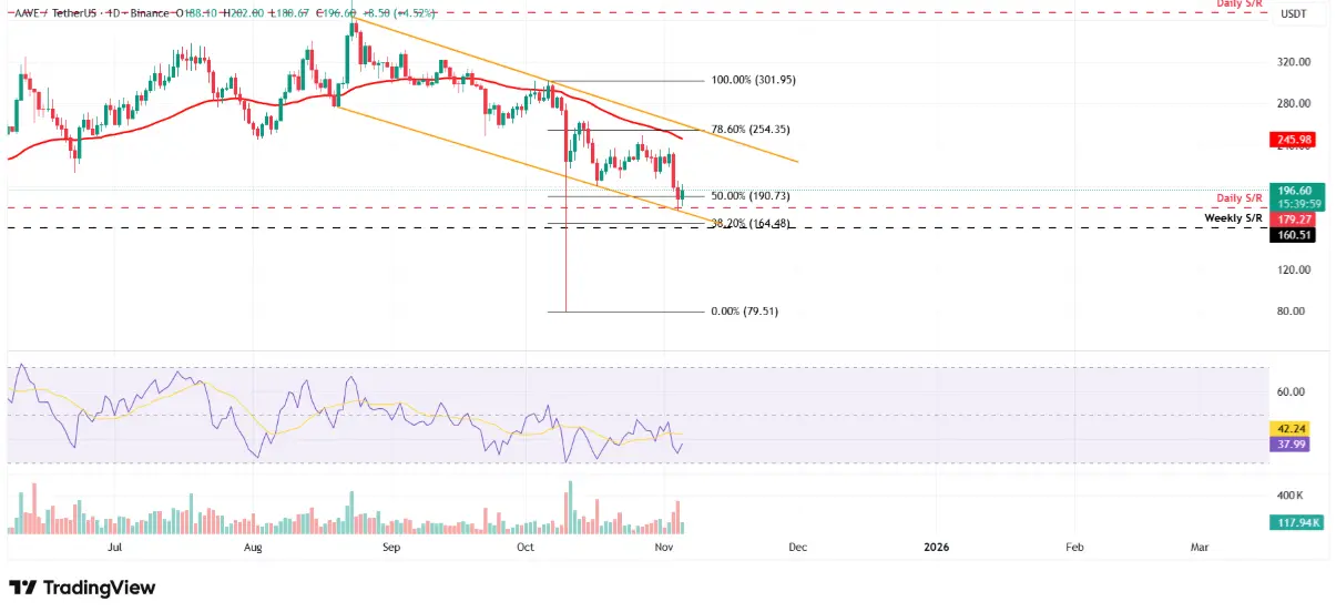Harga Aave (AAVE) sempat ditolak kuat di level Fibonacci 78,6% — setara dengan 254,35 USD — pada tanggal 27/10, sebelum terjun lebih dari 22% dalam waktu 8 hari, kembali memeriksa zona dukungan penting di sekitar 179,27 USD pada hari Selasa. Area ini berada dekat dengan level Fibonacci 50% di 190,73 USD dan bertepatan dengan garis tren bawah dari pola wedge menurun, menjadikannya titik pertahanan kunci bagi para bull. Pada saat penulisan, AAVE berfluktuasi di sekitar 196 USD, sedikit lebih tinggi dari zona dukungan ini.