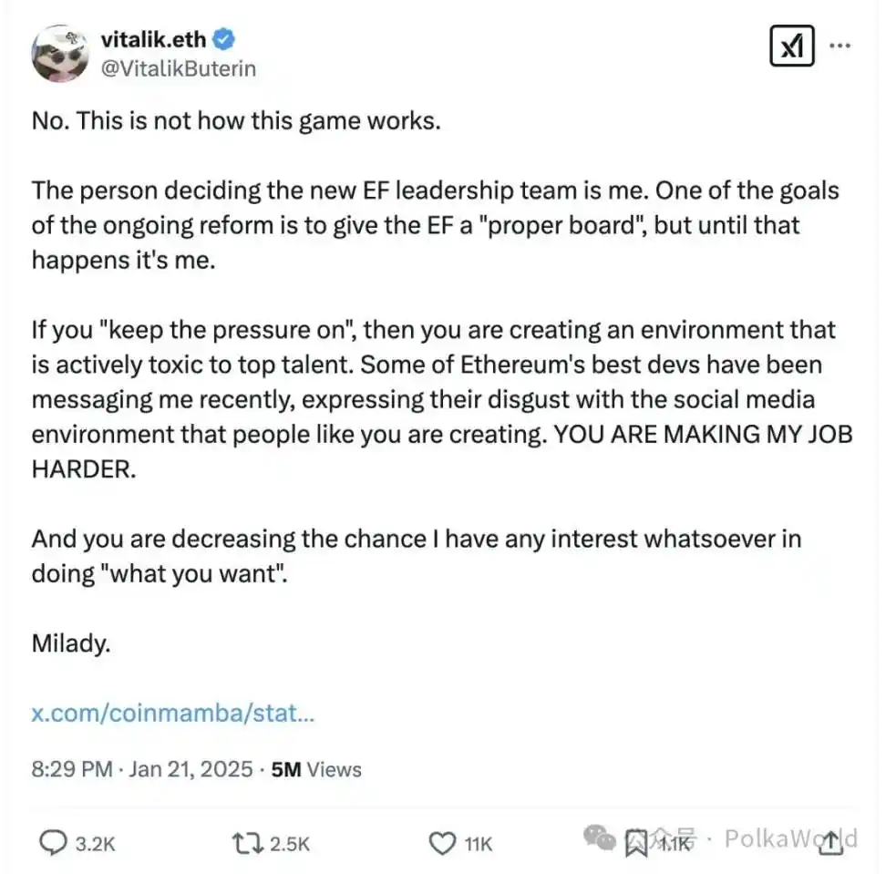 Melihat kriteria ketahanan yang ditentukan oleh Gavin, kelemahan Ethereum menjadi jelas. Ethereum sering dikritik karena pengaruh besar Vitalik Buterin. Secara khusus, salah satu posting terbarunya di X – "Akulah yang memutuskan tim kepemimpinan EF (Ethereum Foundation) yang baru" – meningkatkan kontroversi.