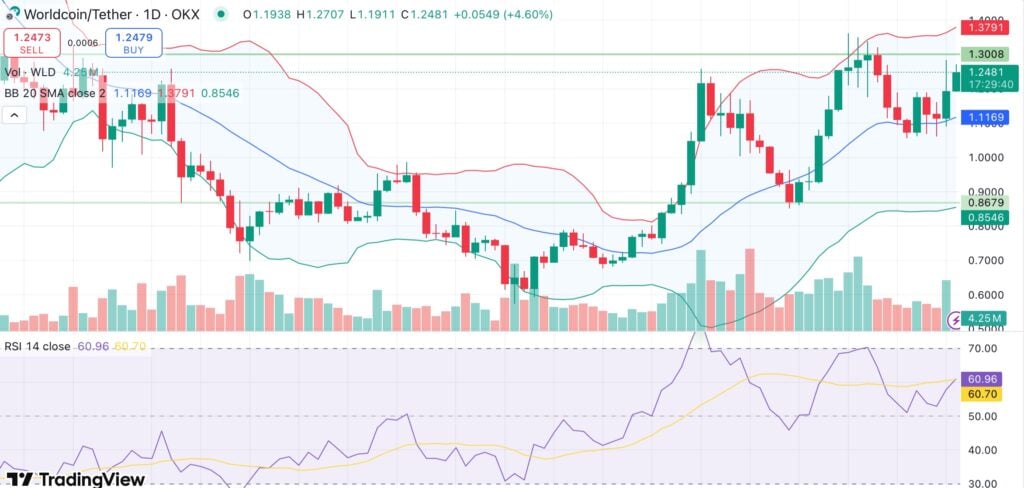 Di sisi teknis, aksi harga Worldcoin menunjukkan tanda-tanda kekuatan. Setelah pulih dari support di sekitar $1,00, telah naik kembali ke $1,24. Pergerakan ini disertai dengan momentum yang kuat dan volume yang meningkat, menunjukkan bahwa bulls mungkin mendapatkan kembali kendali. Harga diperdagangkan di atas rata-rata pergerakan jangka pendek dan menengah, yang saat ini sedang tren naik, seringkali merupakan tanda bullish.