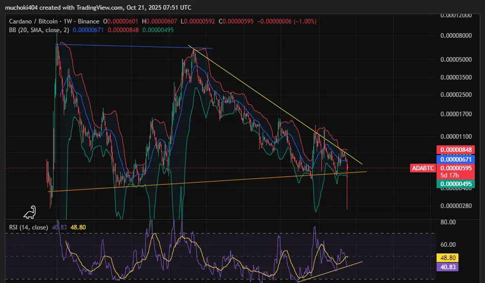 Dari sudut pandang analisis teknis, pasangan ADA/BTC telah membentuk pola pembalikan potensial setelah terjebak dalam tren menurun sejak akhir 2021. Perlu dicatat, Bollinger Bands mingguan telah menyempit dalam waktu dekat, sehingga menunjukkan volatilitas yang lebih tinggi di tengah.