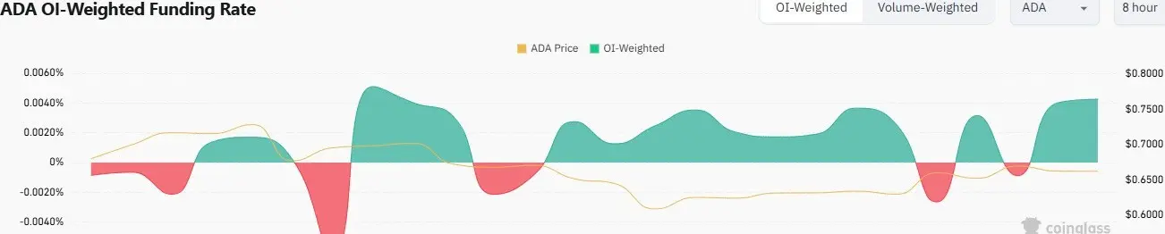 Sementara itu, tingkat pendanaan Cardano tetap positif, yang secara historis terkait dengan sentimen bullish dan sebaliknya.