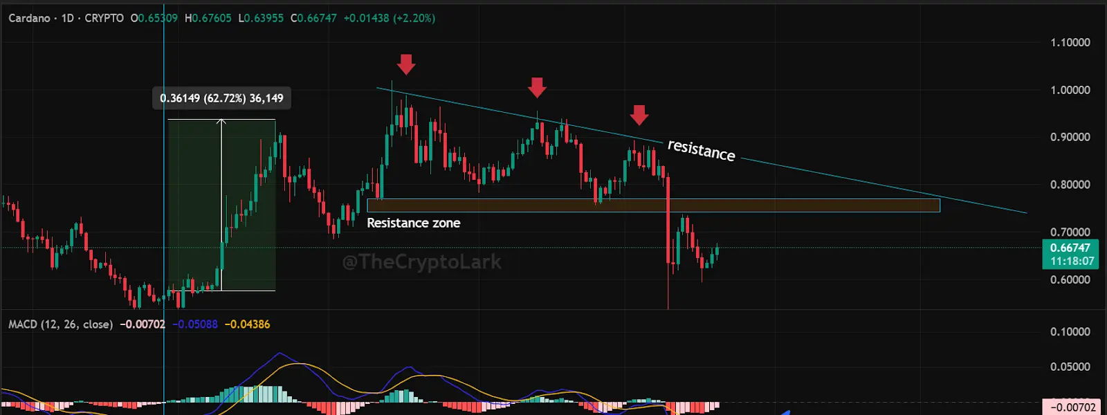 Dalam skenario max pain, pasangan ADA/USD mungkin akan menguji kembali kedua level support sebelum melanjutkan kenaikan ke level tertinggi sepanjang masa. Menurut analis kripto Lark Davis, harga ADA harus secara konsisten naik di atas rentang pasokan antara $0.74 dan $0.77 selain dari tren resistensi logaritmik yang menurun yang telah ditetapkan tahun ini.