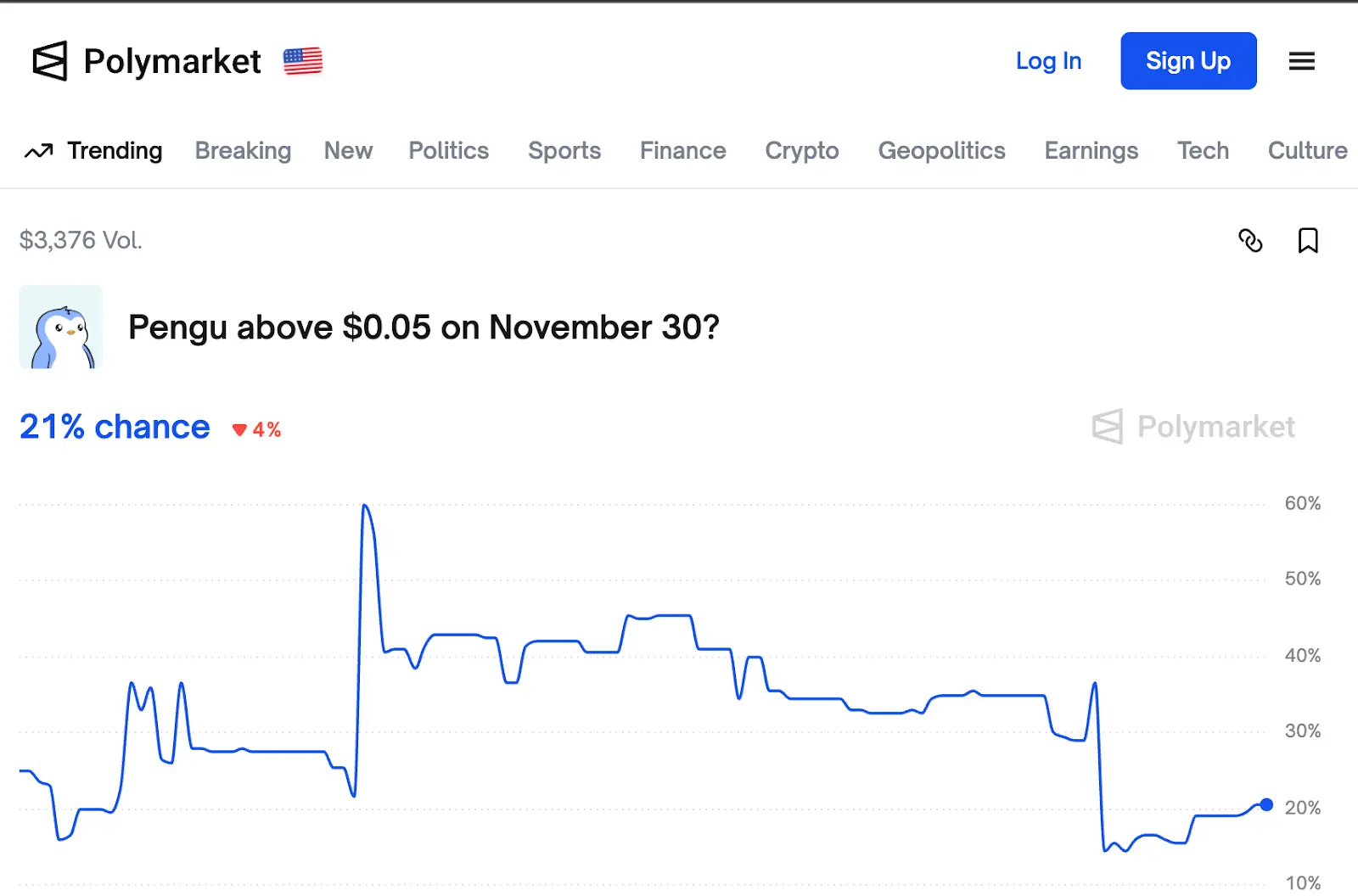 Pasar prediksi tertentu menunjukkan kemungkinan 21% bahwa Pengu akan melebihi $0,05 pada 30 November.