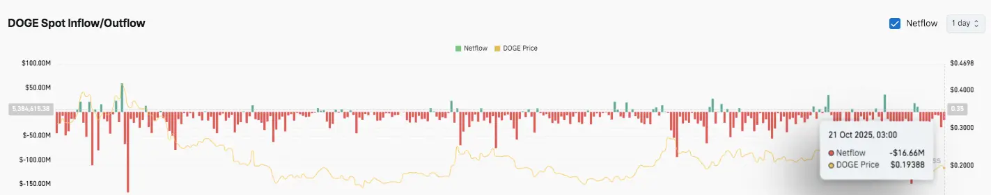 Sebaliknya, aliran modal bersih terus menunjukkan nada pasar yang hati-hati. DOGE telah mencatat aliran keluar bersih yang konsisten sepanjang tahun, total mencapai $16,66 juta hingga 21 Oktober. Meskipun lonjakan aliran masuk yang singkat pada bulan Juli dan September menunjukkan akumulasi sementara, investor tetap ragu untuk meningkatkan eksposur di tengah ketidakpastian pasar yang terus ada.
