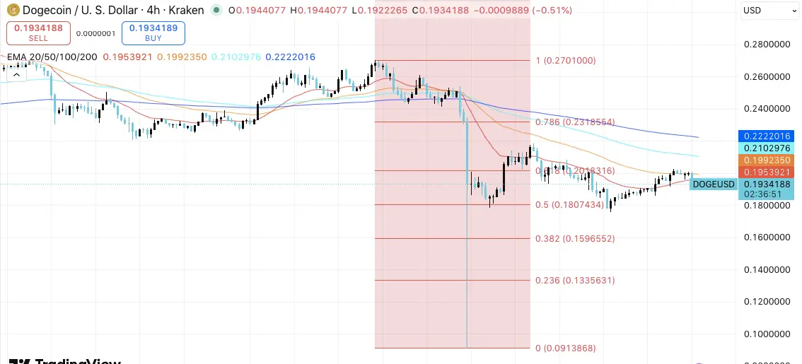 Level kunci tetap jelas didefinisikan saat Dogecoin (DOGE) diperdagangkan di sekitar $0.1934, stabil setelah koreksi terbarunya dari $0.27.